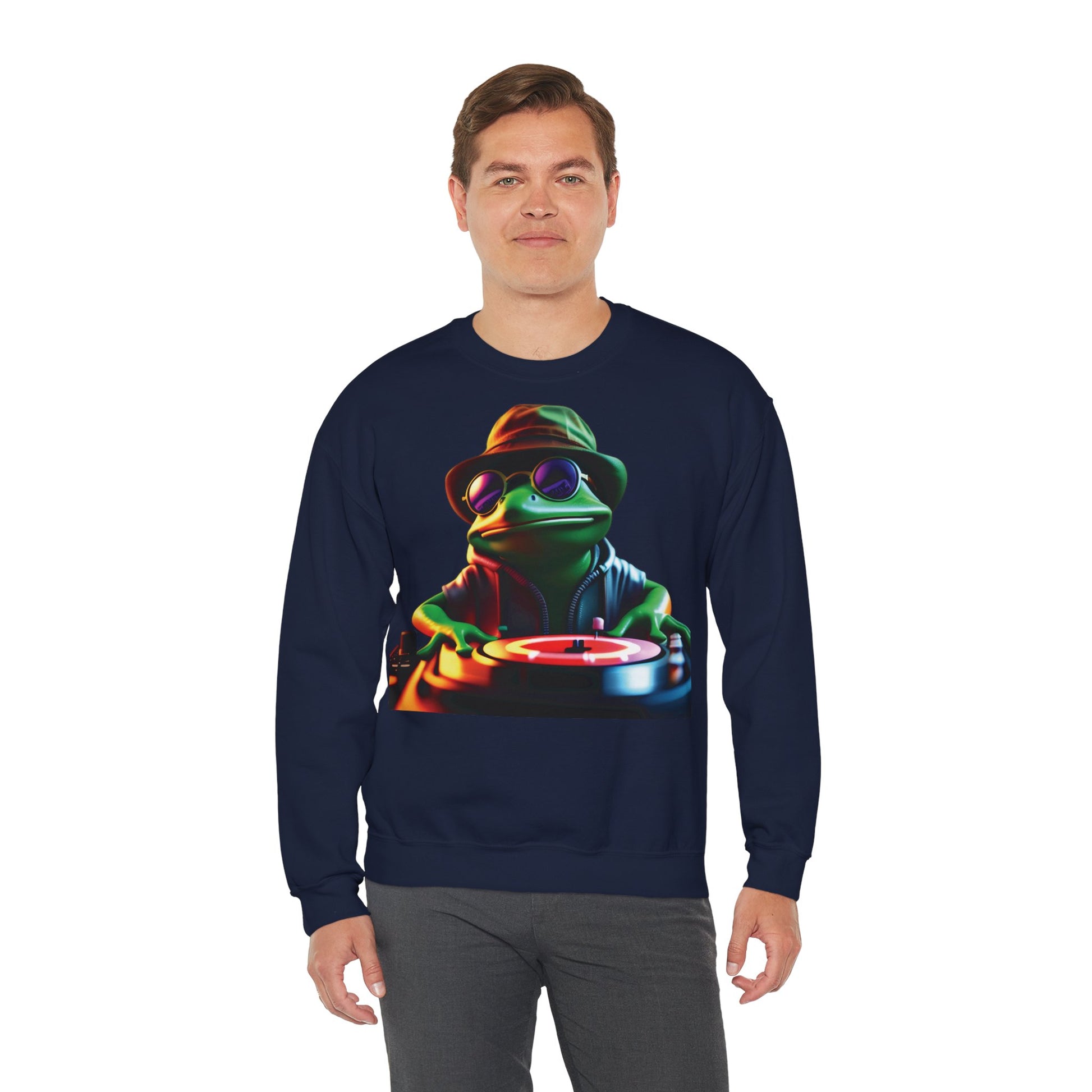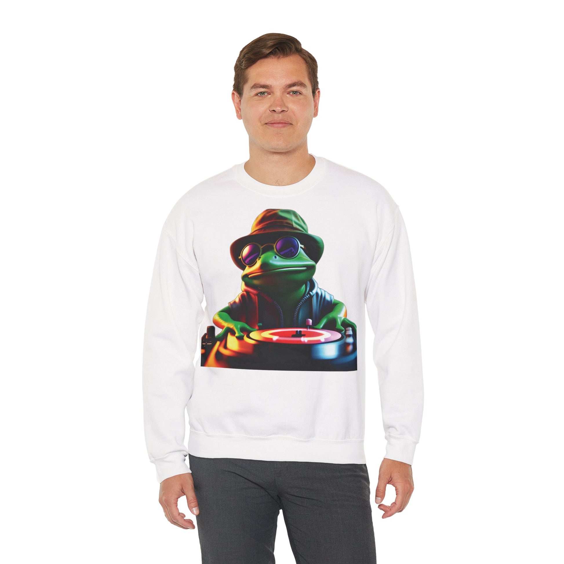Acest sweatshirt moale cu guler rotund aduce o notă jucăușă și de noapte târzie în ținutele de zi cu zi. Pe piept se află un imprimeu îndrăzneț și colorat cu o broască DJ cool — cu pălărie bucket, ochelari de soare și tot tacâmul — care mixează vinil sub lumini neon. Poart-o suprapusă peste un tricou diminețile răcoroase sau ca sweatshirt preferat la întâlniri relaxate și ieșiri în curte. Amestecul moale de greutate medie și croiala clasică oferă o siluetă lejeră care se mișcă odată cu tine. Construcția simplă, durabilă și detaliile atent gândite fac ca piesa să arate purtată și confortabilă de la prima utilizare și să rămână impecabilă în timp.