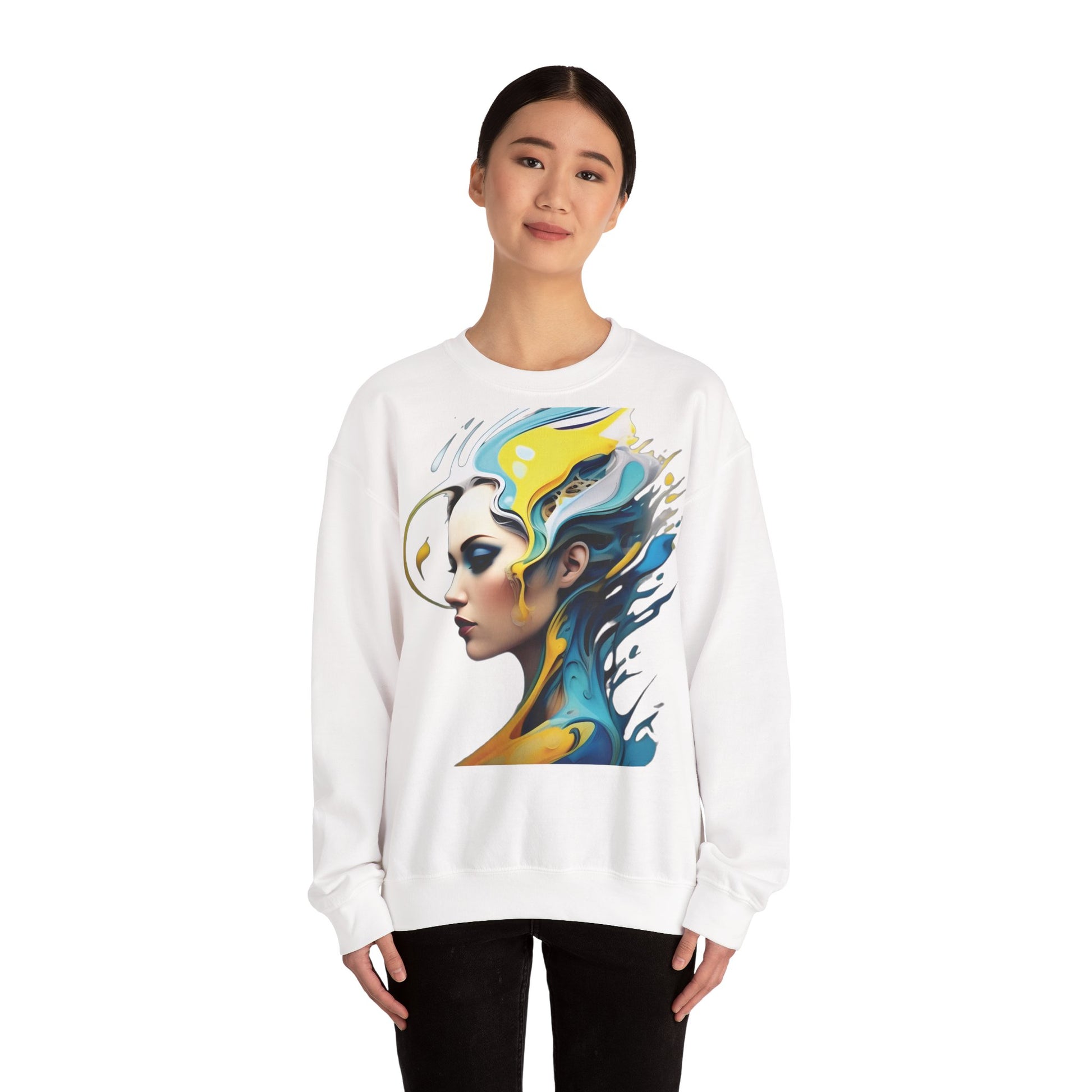 Poartă un moment de introspecție și culoare. Acest sweatshirt tip crewneck prezintă un portret suprarealist impresionant — tușe fluide de turcoaz, auriu și bleumarin profund care curg ca niște pensulații peste un profil calm. Se simte ca o intrare într-un atelier liniștit la apus: gândit, îndrăzneț și discret expresiv.