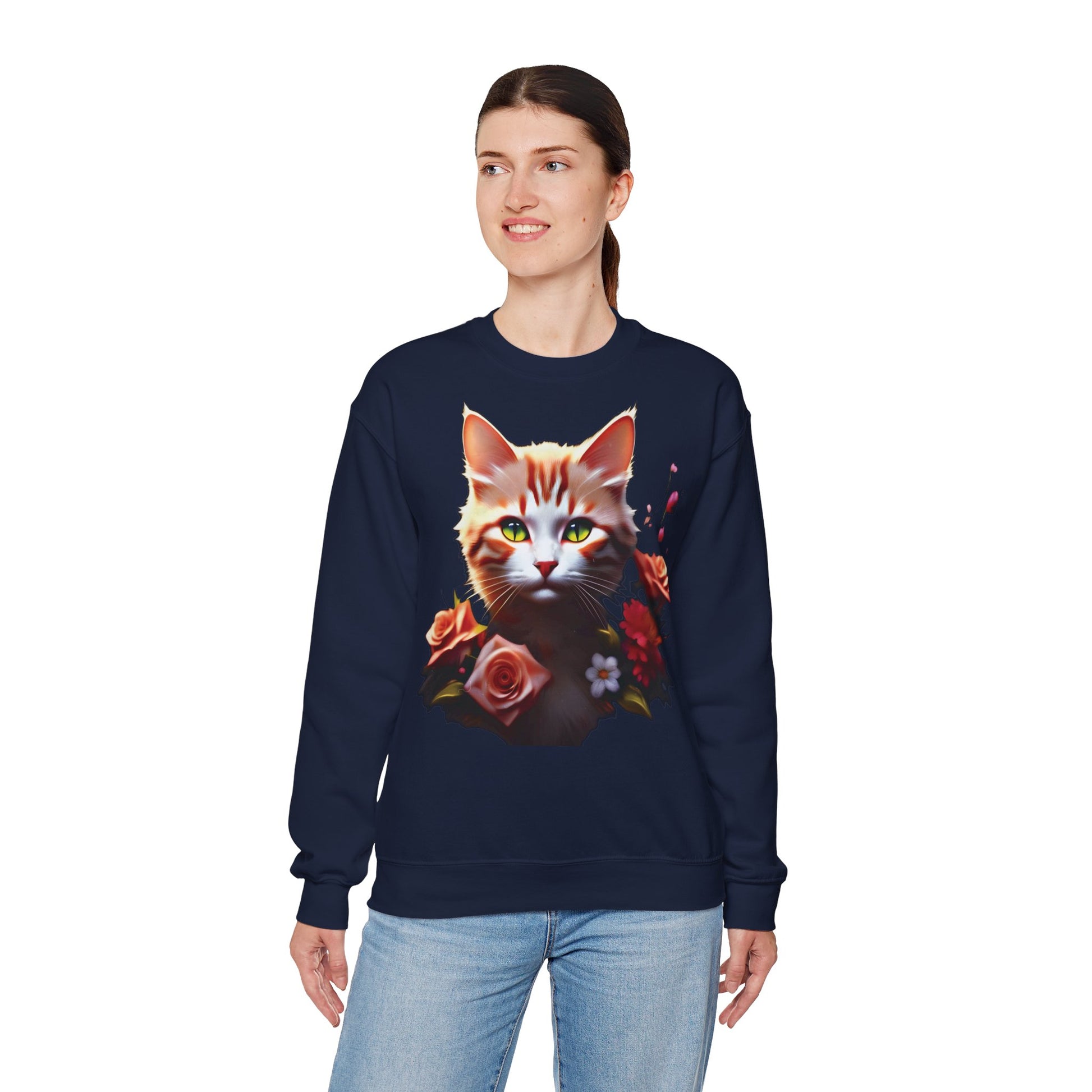 Un sweatshirt crewneck confortabil, care aduce o notă blândă și jucăușă în ținutele de zi cu zi. Partea din față prezintă un portret pictural de pisică, încadrat de trandafiri și flori delicate — ochii vii și tonurile calde creează o atmosferă liniștită, ușor nostalgică. Amestecul mediu-greu de bumbac și poliester 50/50 se simte consistent fără a fi rigid, iar croiala clasică și gulerul ribbed mențin o siluetă curată și ușor de suprapus. Finisajele atent gândite — construcția tubulară, cusăturile duble și eticheta detașabilă — asigură confort la purtare îndelungată. Este genul de piesă la care ajungi în dimineți liniștite cu o cafea, în plimbări prin piața de fermieri sau atunci când te cuibărești cu o carte bună și propriul animal de companie la picioare.