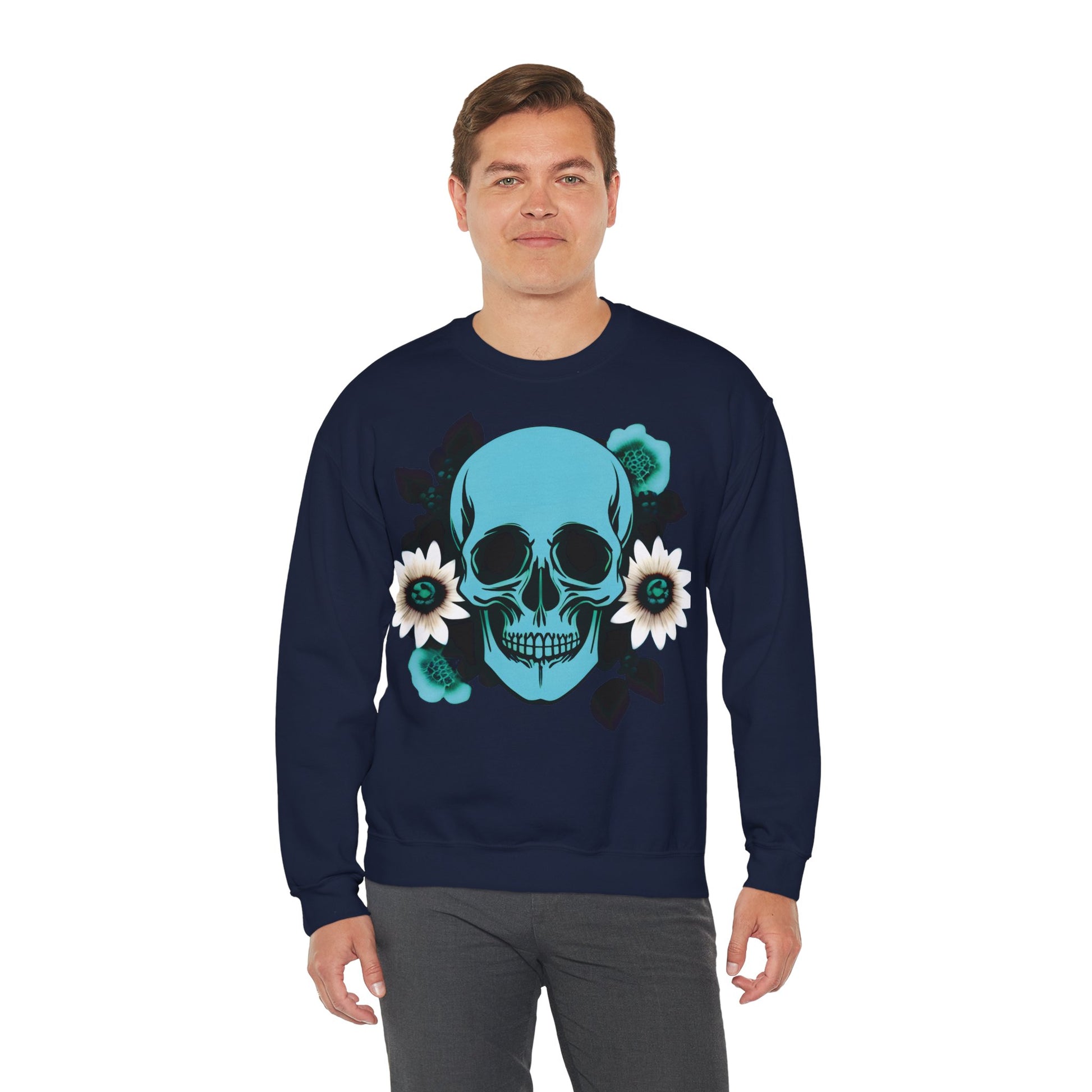 Acest sweatshirt crewneck confortabil îmbină confortul de zi cu zi cu un aer îndrăzneț și artistic. Țesătura medie-grea 50/50 din bumbac și poliester se simte consistentă fără a fi rigidă, iar silueta clasică crewneck se poate purta ușor peste tricouri sau sub jachete. Un craniu turcoaz izbitor, înrămat de frunze închise și flori albe, stă în centrul pieptului, transformând un articol de bază într-o piesă statement care emană atât mister, cât și modernitate. Construcția atentă — cusături duble, guler rib și etichetă detașabilă — îi conferă un aspect purtat și fiabil. Poate fi purtat la plimbări răcoroase, la concerte intime sau în dimineți liniștite cu o cafea în mână; este pentru cei care își doresc ca piesele de bază să aibă personalitate și caracter.