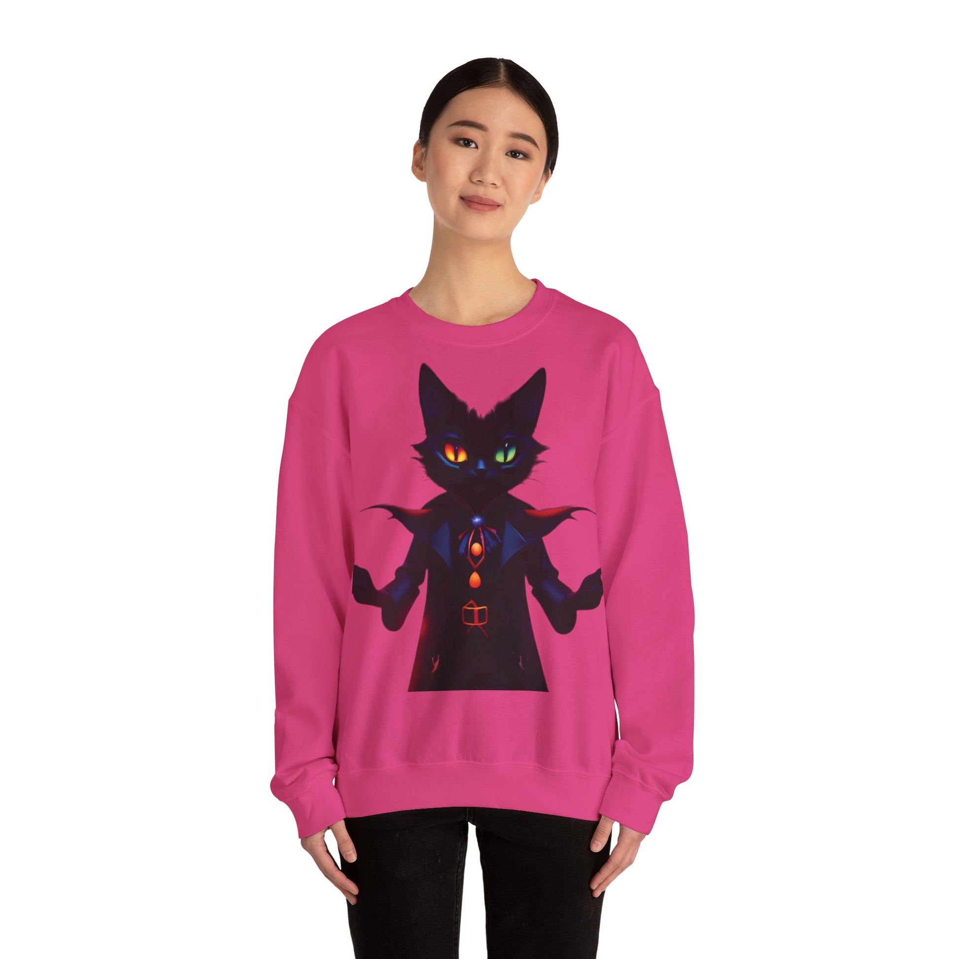 Acest sweatshirt cu decolteu rotund aduce o notă de întuneric fermecător în confortul de zi cu zi. Țesătura moale, de greutate medie, și croiala clasică și curată îl fac ușor de purtat, de la dimineți leneșe până la întâlniri târzii. O ilustrație îndrăzneață și colorată cu o pisică-vampir se află pe piept — ochii în nuanțe prețioase și mici accente de aripi de liliac îi dau un aer jucăuș și ușor misterios, care atrage privirile fără a striga. Cusăturile rezistente, gulerul și manșetele ribate și eticheta detașabilă fac ca fiecare purtare să se simtă atent realizată. Poart-o atunci când vrei să îmbrățișezi un stil jucăuș și căldură blândă.