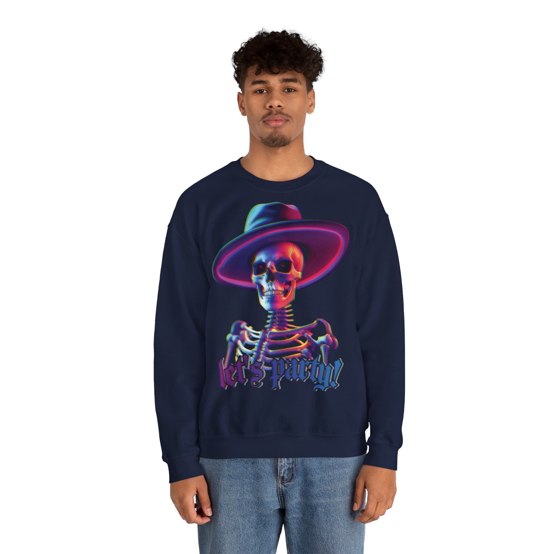 Acest crewneck heavyweight aduce o energie îndrăzneață, de noapte târzie, în ținutele de zi cu zi. Un schelet vibrant, cu efect neon și purtând o pălărie cu boruri largi, te privește de pe piept, cu culori care oscilează între magenta electric, teal și indigo, creând o atmosferă ușor suprarealistă, cu influențe retro-horror. Croiala clasică și lejeră, alături de amestecul moale de bumbac și poliester 50/50, îl fac ușor de purtat peste tricouri sau hanorace atunci când mergi la concerte, seri alternative sau întâlniri relaxate. Detaliile subtile — precum cusăturile curate cu ac dublu, eticheta detașabilă și opțiunile de broderie — oferă piesei un aer atent lucrat și durabil. Este genul de confort care face trimitere la concerte underground, drumuri nocturne și momentele în care vrei ca stilul tău să vorbească puțin mai tare decât cuvintele.