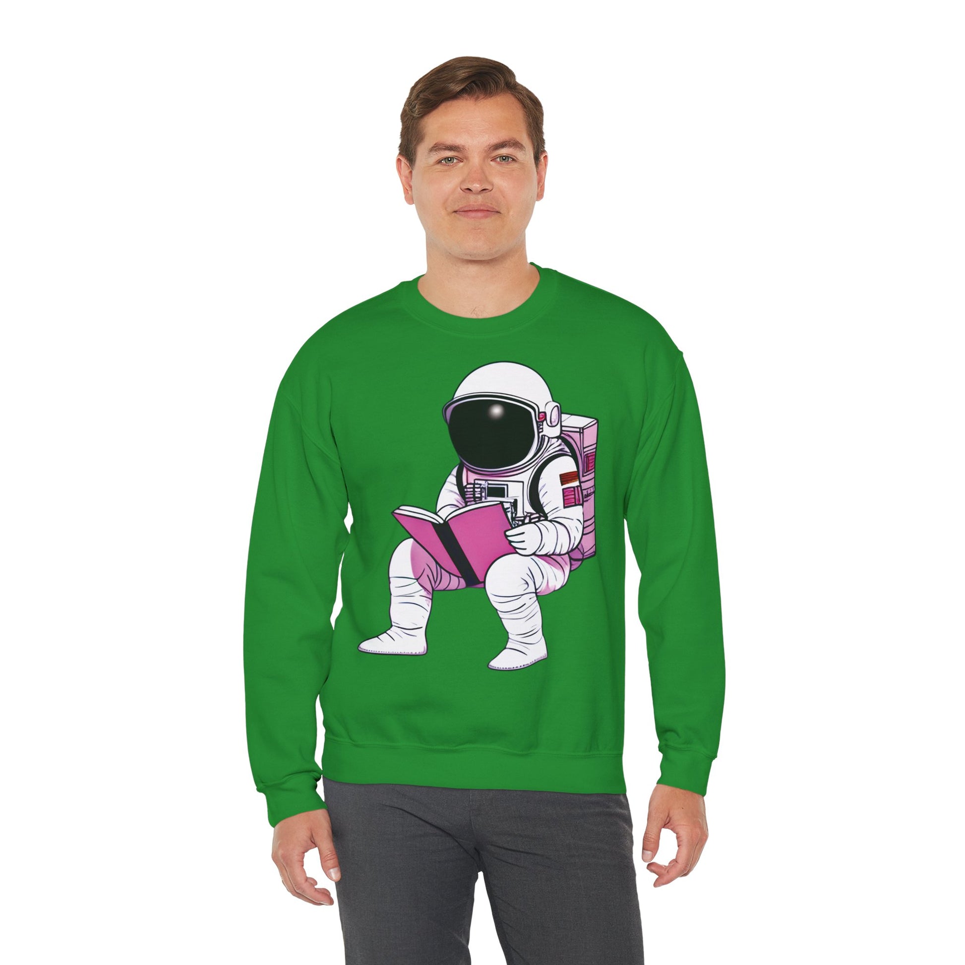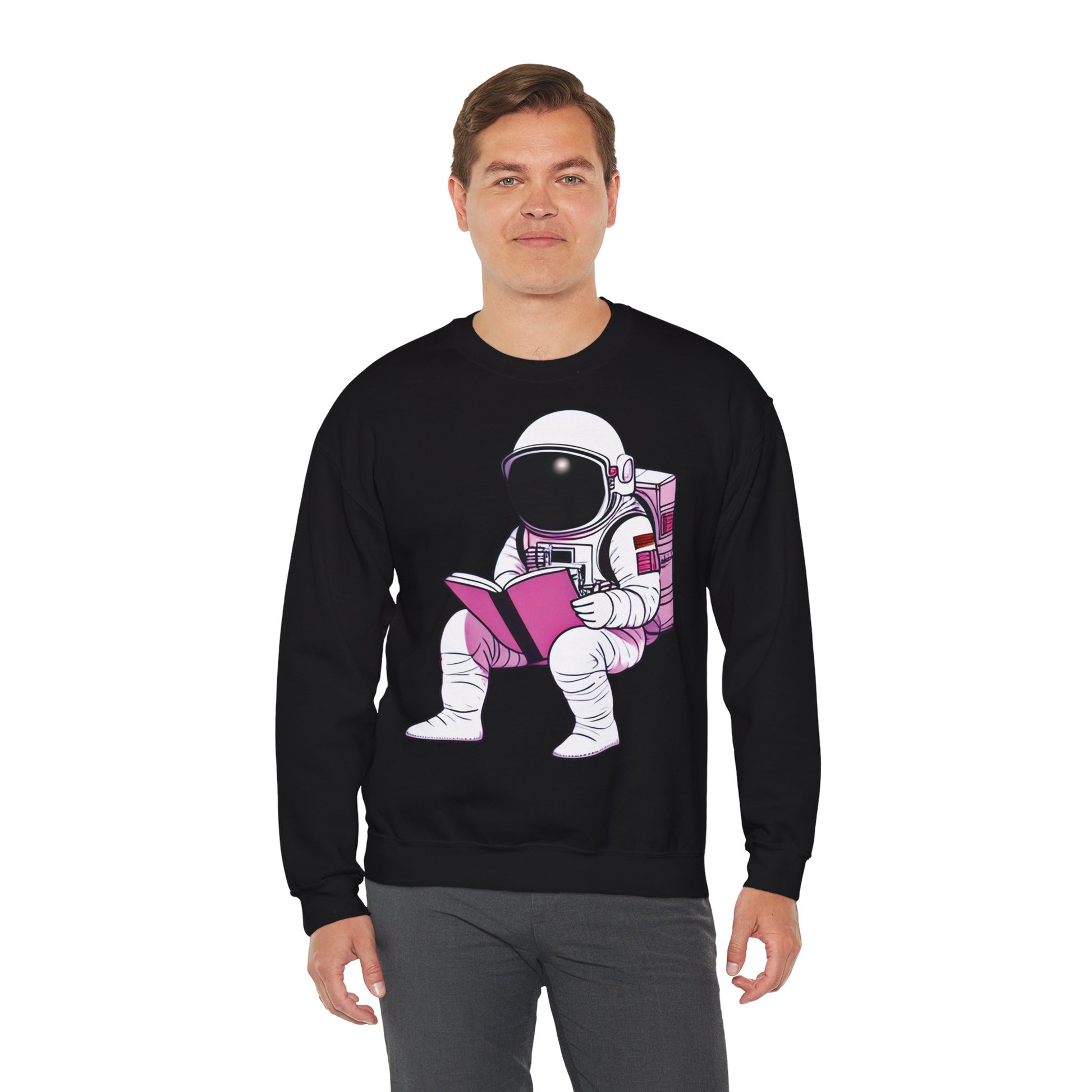 Moale, simplu și cu o notă cosmică — acest crewneck invită la curiozitate liniștită. Imaginea unui astronaut cu accente roz, absorbit de o carte, este plasată central pe piept, suficient de discretă cât să pară personală, dar destul de vizibilă cât să pornească conversații. Ușor, dar bine structurat, sweatshirtul se poartă ca un capitol confortabil: mâneci care stau la locul lor, un guler care își păstrează forma și o etichetă detașabilă, netedă, astfel încât nimic să nu distragă atenția de la moment.