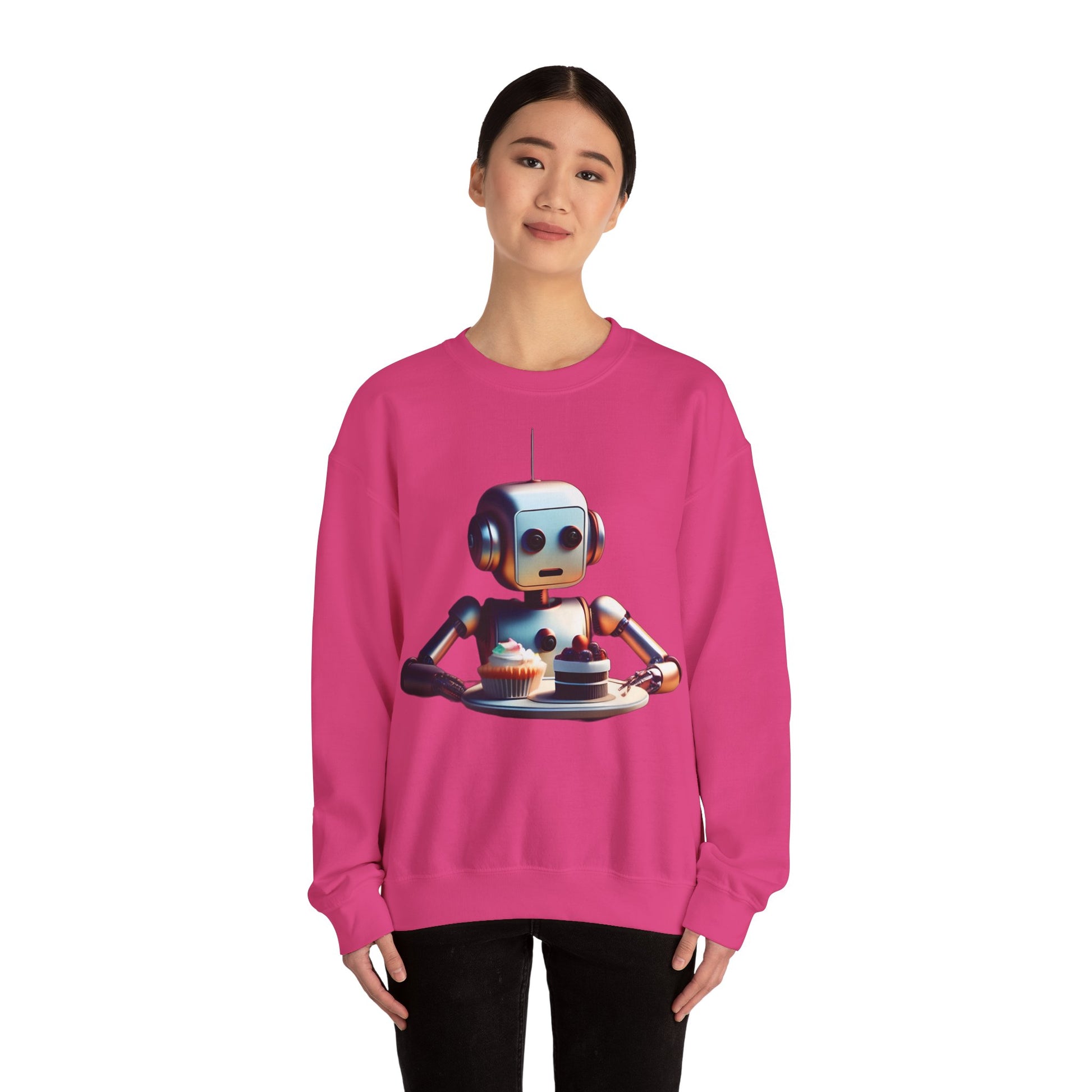 Un sweatshirt cozy, cu un vibe ușor nostalgic — un mic robot prietenos ținând o tavă cu prăjituri stă în centrul designului, redat cu lumini calde și umbre delicate. Amestecul de bumbac și poliester de greutate medie se simte substanțial, dar respirabil, așezându-se ușor peste blugi sau stratificat sub o jachetă. Poartă-l în dimineți liniștite la cafenea, în timpul sesiunilor târzii de codare sau când vrei ceva care să fie jucăuș și gânditor în același timp. Detaliul brodat sau imprimat de pe piept păstrează atenția asupra designului, iar cusăturile rezistente și eticheta detașabilă asigură confortul pentru purtare zilnică.