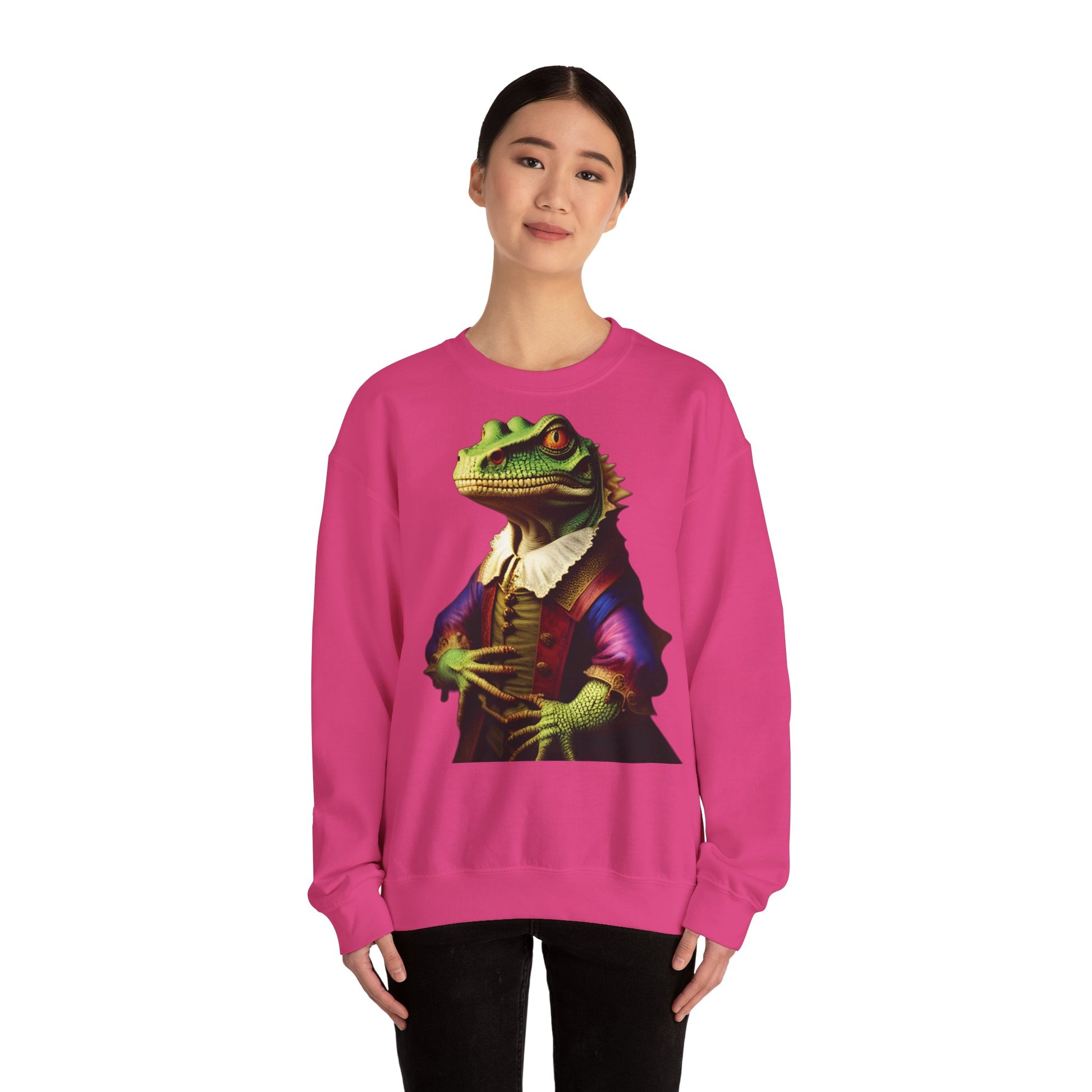 Acest crewneck aduce o notă de sofisticare jucăușă în ținutele de zi cu zi. O șopârlă bogat detaliată, pictată într-un stil artistic și îmbrăcată în haine de epocă, stă mândră pe piept, transformând un sweatshirt simplu într-o piesă care stârnește conversații.